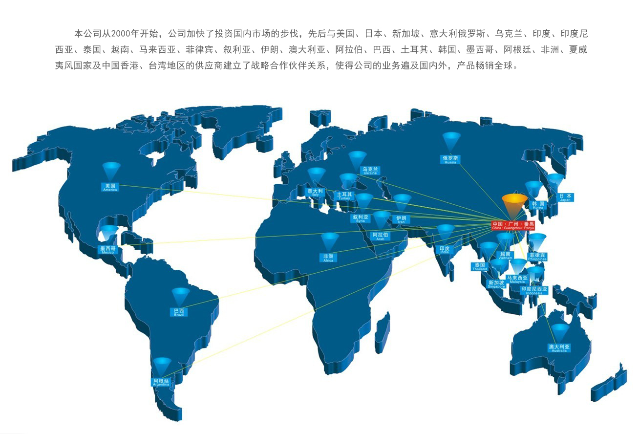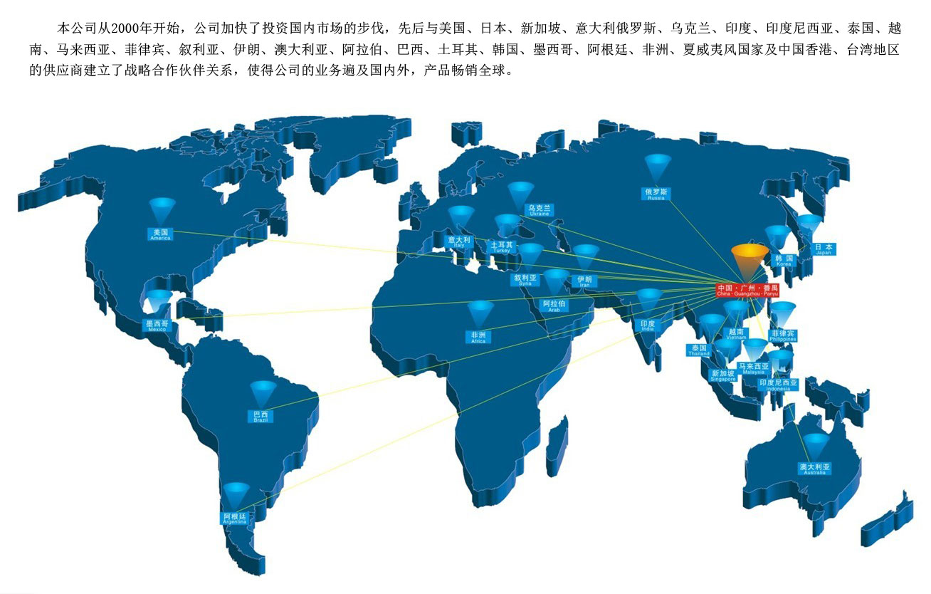 本公司從2000年開始,公司加快了投資國內(nèi)市場的步伐,先后與美國、日本、新加坡、意大利俄羅斯、烏克蘭、印度、印度尼西亞、泰國、越南、馬來西亞、菲律賓、敘利亞、伊朗、澳大利亞、阿拉伯、巴西、土耳其、韓國、墨西哥、阿根廷、非洲、夏威夷風(fēng)國家及中國香港、臺灣地區(qū)的供應(yīng)商建立了戰(zhàn)略合作伙伴關(guān)系,使得公司的業(yè)務(wù)遍及國內(nèi)外,產(chǎn)品暢銷全球。